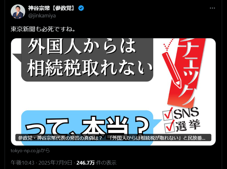 参政党・神谷「外国人から相続税は取れないんですよ」東京新聞「デマです」神谷「東京新聞必死だな」 2025年07月11日 カテゴリ:参政党デマ 1: それでも動く名無し 2025/07/10(木) 08:20:02.86 ID:JTBeO0qt0 https://www.tokyo-np.co.jp/article/419465 参政党の神谷宗幣(そうへい)代表が6日、フジテレビの番組「日曜報道 THE PRIME」で、「外国人からは相続税が取れない」と発言した。これは正しいのだろうか。相続税の仕組みとともにチェックした。 各党の代表が出席し、「外国人の不動産購入に規制は必要か」をテーマに議論した際、神谷氏は「必要」という立場を明確にし、こう発言した。「オーストラリアや中国には相続税がないから、買っておいて日本に住んでいなければ相続税を取りようがない」 国税庁によると、日本国内の土地や建物などの財産は課税対象となり、所有者(被相続人)や相続する人がどこの国籍であろうと、どこに住んでいようと、税を支払う必要がある。 つまり、神谷氏の番組での発言は「誤り」だ。 登記によって不動産の移動は把握でき、差し押さえなどで対応も可能だ。 国税庁資産課税課の担当者は「交流サイト(SNS)で、(神谷氏のような)発言を見かけることもあるが、課税対象の条件はホームページ上に表も掲載している」と話し、確認するよう呼びかけた。 引用元:https://nova.5ch.net/test/read.cgi/livegalileo/1752103202/ 【参政党・神谷「外国人から相続税は取れないんですよ」東京新聞「デマです」神谷「東京新聞必死だな」】の続きを読む タグ :#神谷宗幣#参政党#相続税#不動産#土地#固定資産税
