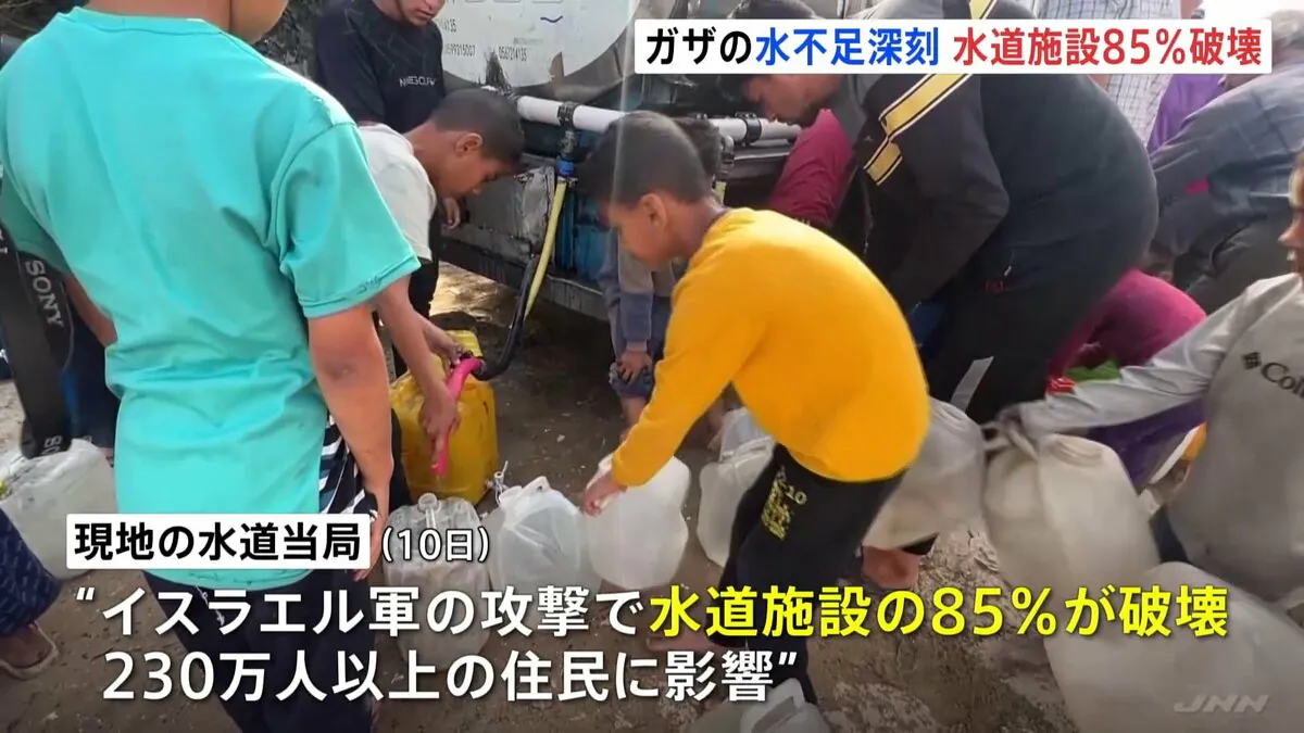 最近数週間、ガザ地区では深刻な水不足が続いている。燃料不足で海水淡水化装備や衛生施設が稼働を停止し、住民たちは水の配給を受けるために給水施設に依存している。