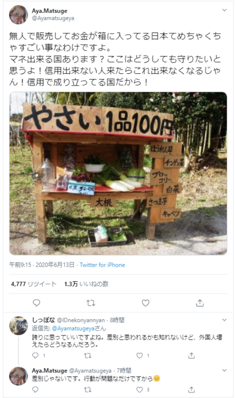 愛国ツイッタラー「無人販売所出来る日本凄い!!日本は信用で成り立ってる国!」→韓国にもありますよ 2020年06月17日 カテゴリ:韓国 1: 風吹けば名無し 2020/06/14(日) 05:20:47.16 ID:KLnhFrNRp 無人で販売してお金が箱に入ってる日本てめちゃくちゃすごい事なわけですよ。 マネ出来る国あります?ここはどうしても守りたいと思うよ!信用出来ない人来たらこれ出来なくなるじゃん!信用で成り立ってる国だから! ↓ こちらは韓国の無人販売所の写真です。 こういう信頼関係で成り立つシステム、素晴らしいですよね! 引用元: https://swallow.5ch.net/test/read.cgi/livejupiter/1592079647/ 【愛国ツイッタラー「無人販売所出来る日本凄い!!日本は信用で成り立ってる国!」→韓国にもありますよ】の続きを読む タグ :#ホルホル#自慢#自画自賛#無知#ネトウヨ