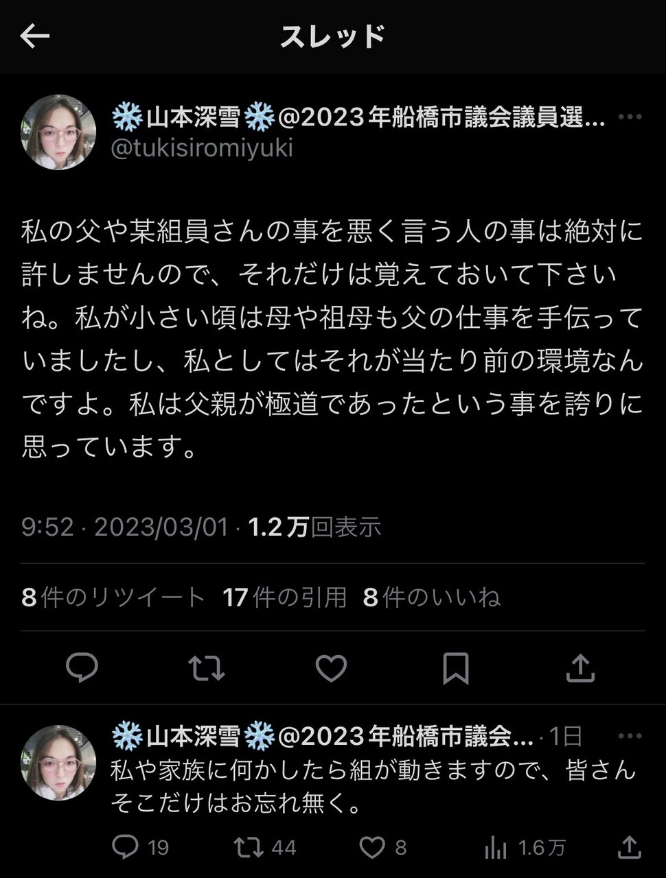 【悲報】市議会議員候補者さん「私の父は極道。父が極道だったことを誇りに思っている」 2023年03月03日 カテゴリ:反社 1: それでも動く名無し 2023/03/02(木) 17:21:20.46 ID:RVS0Zg580 引用元:https://nova.5ch.net/test/read.cgi/livegalileo/1677745280/ 【【悲報】市議会議員候補者さん「私の父は極道。父が極道だったことを誇りに思っている」】の続きを読む タグ :#反社#自慢#バック#暴力団