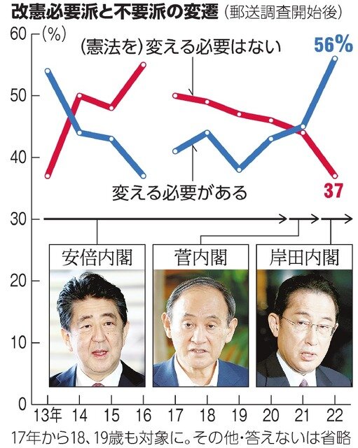 安倍晋三氏が首相在任中の2020年4月の調査では、当時の安倍首相の在任中の憲法改正に「賛成」は36%で、「反対」の46%を下回った。