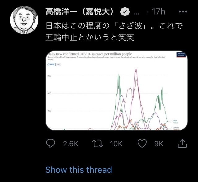 【正論】高橋洋一内閣官房参与「日本のコロナはこの程度のさざ波。これで五輪中止とかいうと笑笑」 2021年05月10日 カテゴリ:政府 1: 風吹けば名無し 2021/05/10(月) 04:10:08.72 ID:tfju5/cxM そりゃ本気で対策せんわ 引用元:https://swallow.5ch.net/test/read.cgi/livejupiter/1620587408/https://swallow.5ch.net/test/read.cgi/livejupiter/1620570764/ 【【正論】高橋洋一内閣官房参与「日本のコロナはこの程度のさざ波。これで五輪中止とかいうと笑笑」】の続きを読む タグ :#高橋洋一#嘉悦大学#内閣官房参与#時計#さざ波#認識#税金