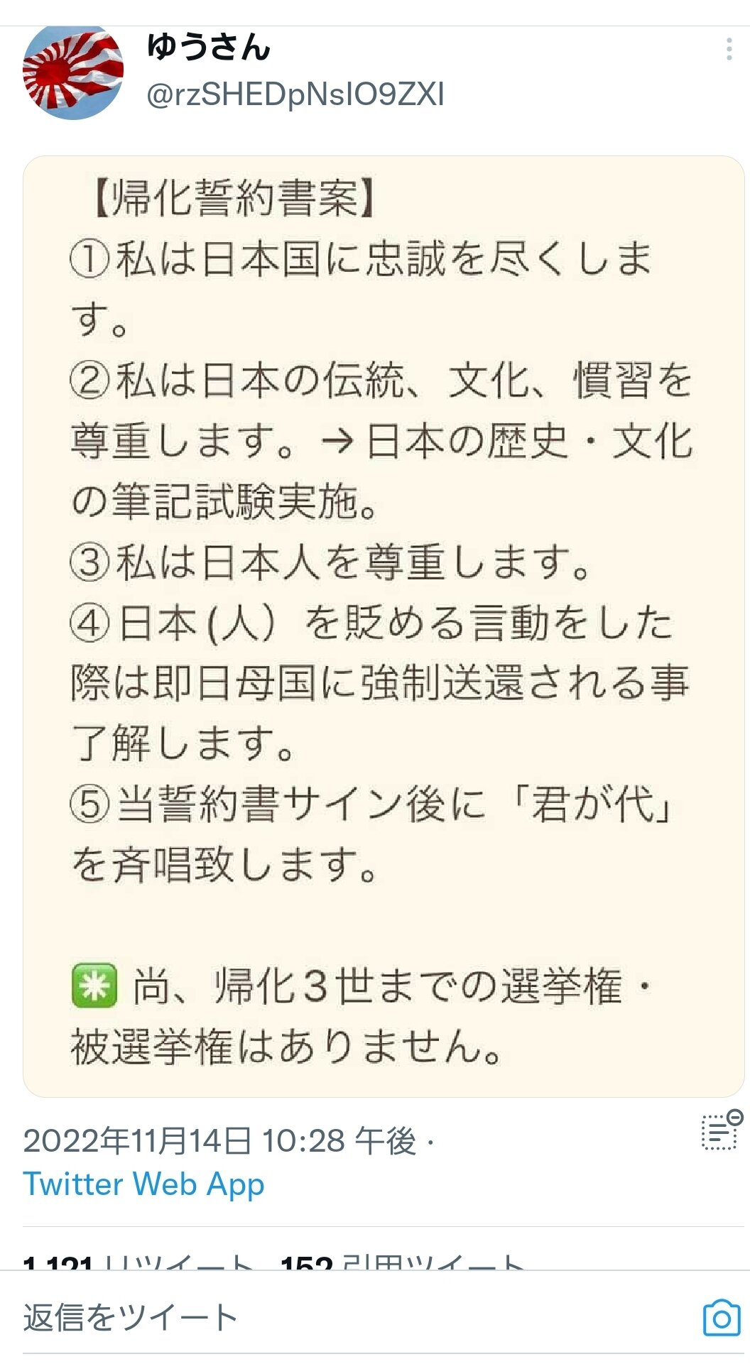 愛国者さん、画期的な帰化誓約書案を発表する!4000いいね 2022年11月20日 カテゴリ:愛国 1: 風吹けば名無し 2022/11/18(金) 08:31:55.06 ID:v1AxKSiK0 https://twitter.com/rzSHEDpNsIO9ZXI/status/1592147479285620741?t=m0CeqfzC0Pz7vpuhNLNMTA&s=19 すばらしい 引用元:https://eagle.5ch.net/test/read.cgi/livejupiter/1668727915/ 【愛国者さん、画期的な帰化誓約書案を発表する!4000いいね】の続きを読む タグ :#誓約書#帰化#愛国#筆記試験