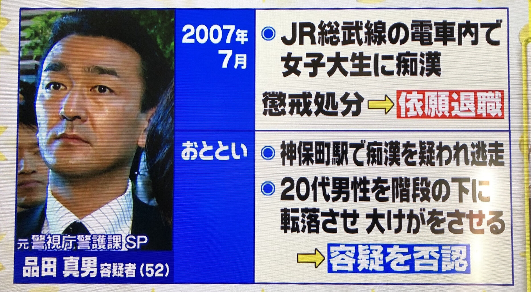 起訴された50代男性は元警視庁警護課で要人警護の経験もあった。また、2007年にも痴漢行為をとがめた男性を突き飛ばして負傷させていた。