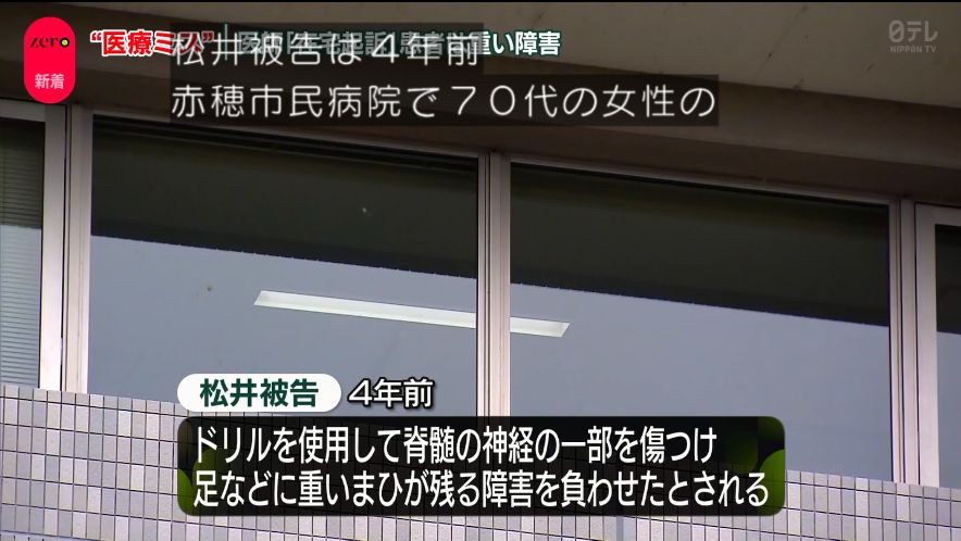 赤穂市民病院の脳神経外科に勤めていた医師の松井宏樹被告(47)は2020年、70代の女性の腰痛を改善するための手術で、ドリルを使用して誤って脊髄の神経を切断し、女性の足などに重い障害を負わせたとして、去年、業務上過失致傷の罪で在宅起訴されています。女性の足には重いまひが残ったほか、疼痛に苦しめられるようになったということです。