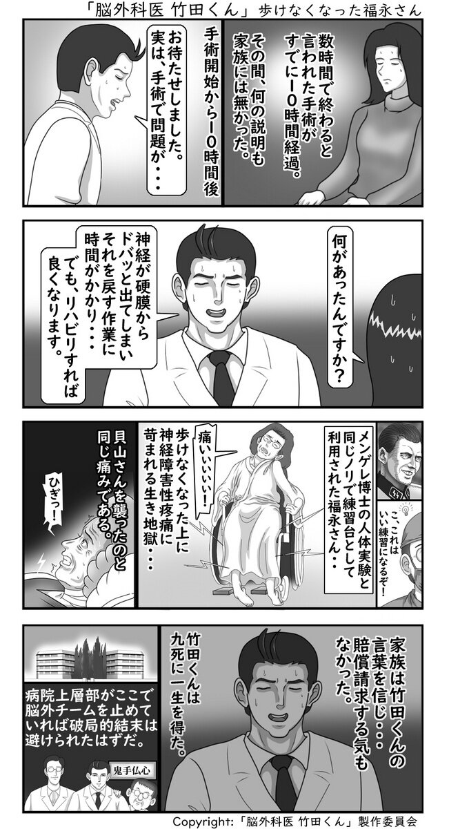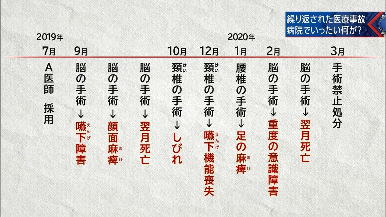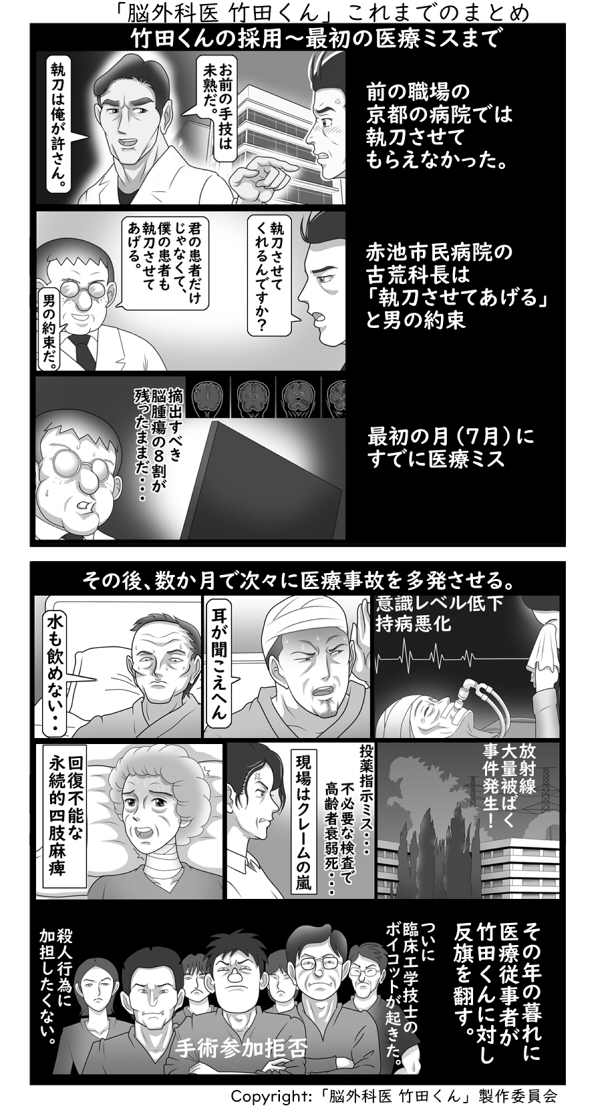 赤穂市民病院が公表した検証委員会の報告書によれば、松井被告はこのほかにも少なくとも7件の医療事故に関わり2人が死亡しています。一連の問題は、被害者の親族によって漫画作品化されていて、「脳外科医 竹田くん」というタイトルでインターネット上に公開されていました。