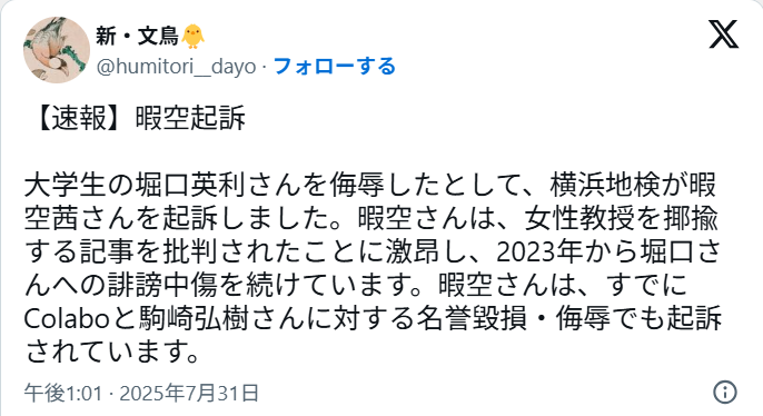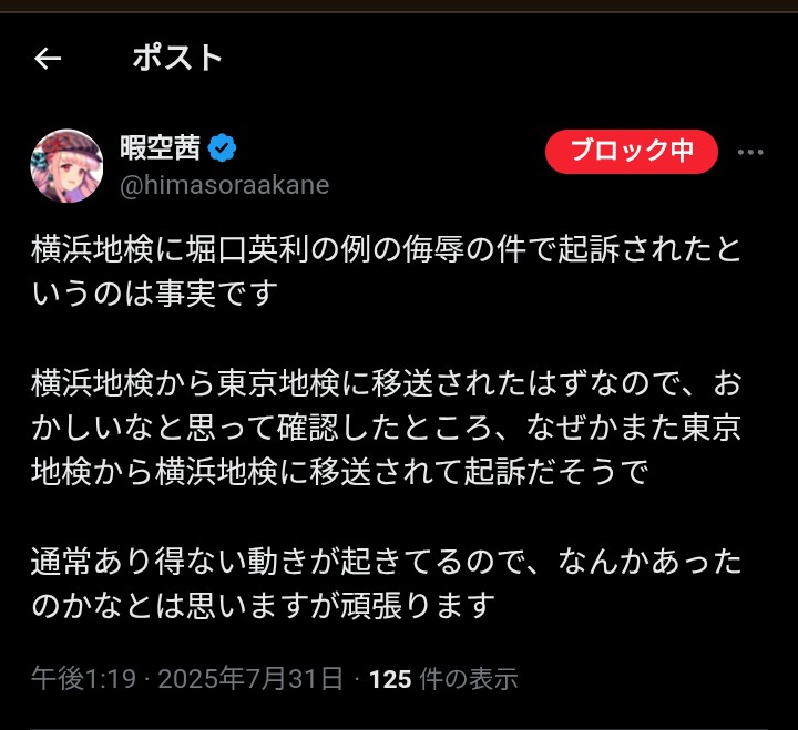 【速報】暇空茜、堀口英利氏への件でも起訴 2025年07月31日 カテゴリ:YouTuber/インフルエンサー 2: それでも動く名無し 2025/07/31(木) 13:28:34.98 ID:0qK/hcmB0 おソース 引用元:https://nova.5ch.net/test/read.cgi/livegalileo/1753936104/https://hayabusa.open2ch.net/test/read.cgi/livejupiter/1753948344/3: それでも動く名無し 2025/07/31(木) 13:29:32.20 ID:OxLI2WJy0 興味ないよ 4: それでも動く名無し 2025/07/31(木) 13:29:57.89 ID:0qK/hcmB0 >>3 そんなこと言っちゃってぇ~ 9: それでも動く名無し 2025/07/31(木) 13:39:55.74 ID:pmopqqfg0 久しぶりに見たけど仁藤が相手じゃないんかい 10: それでも動く名無し 2025/07/31(木) 13:42:21.47 ID:0qK/hcmB0 >>9 コラボ(仁藤の団体) フローレンス(仁藤と対立してる別の団体) への誹謗中傷二件はすでに起訴されてる 1: 名無しさん@おーぷん 25/07/31(木) 16:52:24 ID:CR5h ついでに今日、暇空さんが東京都に起こしたColabo関連の公文書非開示決定についての控訴も棄却されたとのこと 3: 名無しさん@おーぷん 25/07/31(木) 16:52:53 ID:CR5h https://twitter.com/humitori__dayo/status/1950768815605961066?s=46 6: 名無しさん@おーぷん 25/07/31(木) 16:54:06 ID:LX4V 最初は良かった↑これ最初からおかしかったのに認めたくない奴がよく言ってるよな 11: 名無しさん@おーぷん 25/07/31(木) 16:55:36 ID:H3F0 こいつが都知事になってれば今頃都民はみんな毎月クーポン貰えて幸せな生活送れてたのに… 17: 名無しさん@おーぷん 25/07/31(木) 17:14:34 ID:SF0M これは刑事事件の扱いなの? 18: 名無しさん@おーぷん 25/07/31(木) 17:16:40 ID:CR5h >>17うん 21: 名無しさん@おーぷん 25/07/31(木) 17:22:46 ID:1OnT まーた負けるんか 28: 名無しさん@おーぷん 25/07/31(木) 17:36:15 ID:BEcX なんかいっつも裁判やってない? タグ :#起訴#横浜地検#刑事裁判#誹謗中傷