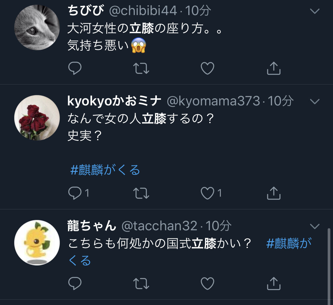 大河『麒麟がくる』に対し「女の座り方がおかしい、朝鮮式か?」ネトウヨ発狂 2020年03月21日 カテゴリ:歴史文化 1: 風吹けば名無し 2020/03/15(日) 21:34:07.52 ID:AvlZZCGF0 大河 愛国戦士発狂 参考 引用元: https://swallow.5ch.net/test/read.cgi/livejupiter/1584275647/ 【大河『麒麟がくる』に対し「女の座り方がおかしい、朝鮮式か?」ネトウヨ発狂】の続きを読む タグ :#大河ドラマ#麒麟がくる#無知#ネトウヨ#時代劇#正座#立膝