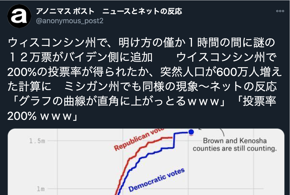 「ウィスコンシン州で投票率が200%!不正選挙だ!」→FOXニュースですら否定。信じているのは日本のネトウヨだけだった… 2020年11月05日 カテゴリ:アメリカ 1: 風吹けば名無し 2020/11/05(木) 12:46:48.99 ID:RpS0jcqP0 米大統領選「バイデン氏の不正疑惑で州兵投入」「ウィスコンシン州で投票率200%」は誤り。日本だけで拡散 「ミルウォーキー・ジャーナル・センティネル」も電子版で「バイデン氏は、圧倒的に民主党票が多かったミルウォーキー約17万人の不在者投票が報告された早朝、トランプ氏を追い抜いた」と伝えている。 不正があった、という現地報道は一切ない。 また、「投票率が200%」という情報も誤りだ。これについても、根拠となるような公的な情報、現地報道は一切ない。 午後9時すぎから日本のネット掲示板「5ちゃんねる」で話題となり、また同じころからTwitterでも同様の情報が拡散。午後10時半ごろには「投票率200」がトレンド入りした。https://www.buzzfeed.com/jp/kotahatachi/milwaukee200アメリカ大統領選では、激戦州の一つであるウィスコンシン州でバイデン氏の勝利が確実な情勢だ。開票終盤には、バイデン氏の得票が急増したことで「投票率が100%を超えた」などとする情報が日本のTwitterでも拡散された。しかし、ウィスコンシン州の選挙管理委員会のほか、保守系のFOXニュースなどが相次いでこの疑惑を否定している。怪しいので州兵が参加?保守系ニュースも否定拡散されたのは、ウィスコンシン州の開票作業で『突如謎の12万票が追加された』『投票率が100%を超えた(200%とも)』『怪しいので州兵が集計に参加』などといったものだ。ツイッターの情報をもとに、まとめブログが掲載したことで広まったとみられる。https://news.yahoo.co.jp/articles/11c13a6fa21db4418173a4f59d256a05e12770be 引用元:https://swallow.5ch.net/test/read.cgi/livejupiter/1604548008/ 【「ウィスコンシン州で投票率が200%!不正選挙だ!」→FOXニュースですら否定。信じているのは日本のネトウヨだけだった…】の続きを読む タグ :#米大統領選#投票率200%#不正選挙#ウィスコンシン州#FOXニュース#州兵#デマ